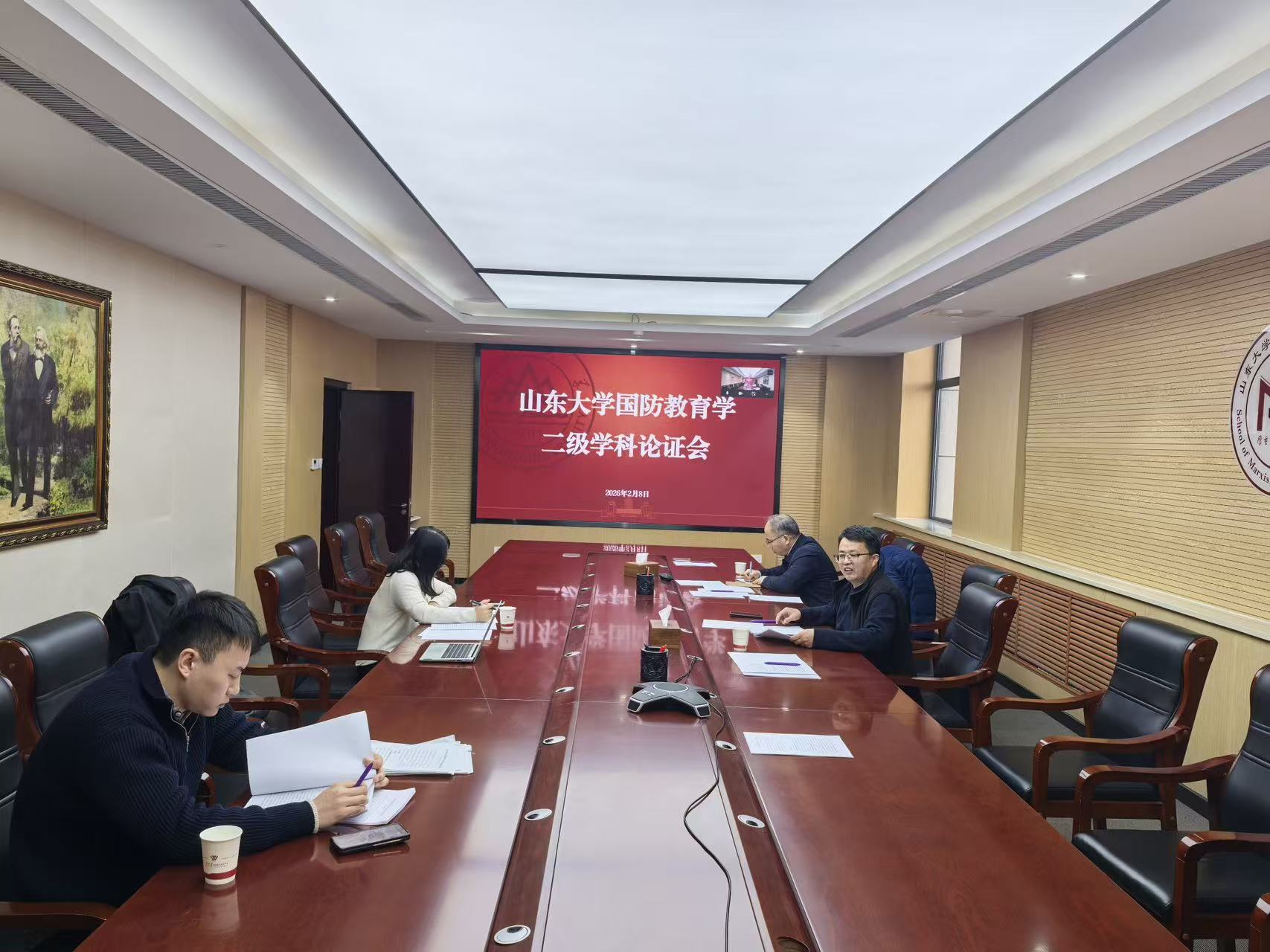 为推动山东大学国防教育二级学科建设,2026年2月8日下午,山东大学马克思主义学院召开国防教育二级学科建设专家论证会议。会议由马克思主义学院院长张士海教授主持。 论证专家组由军事法制研究院王淑梅研究员、天津大学马克思主义学院院长颜晓峰教授、南京师范大学马克思主义学科集群(学部)部长王永贵教授、西安交通大学马克思主义学院院长燕连福教授、武汉大学马克思主义学院院长罗永宽教授、东北师范大学马克....