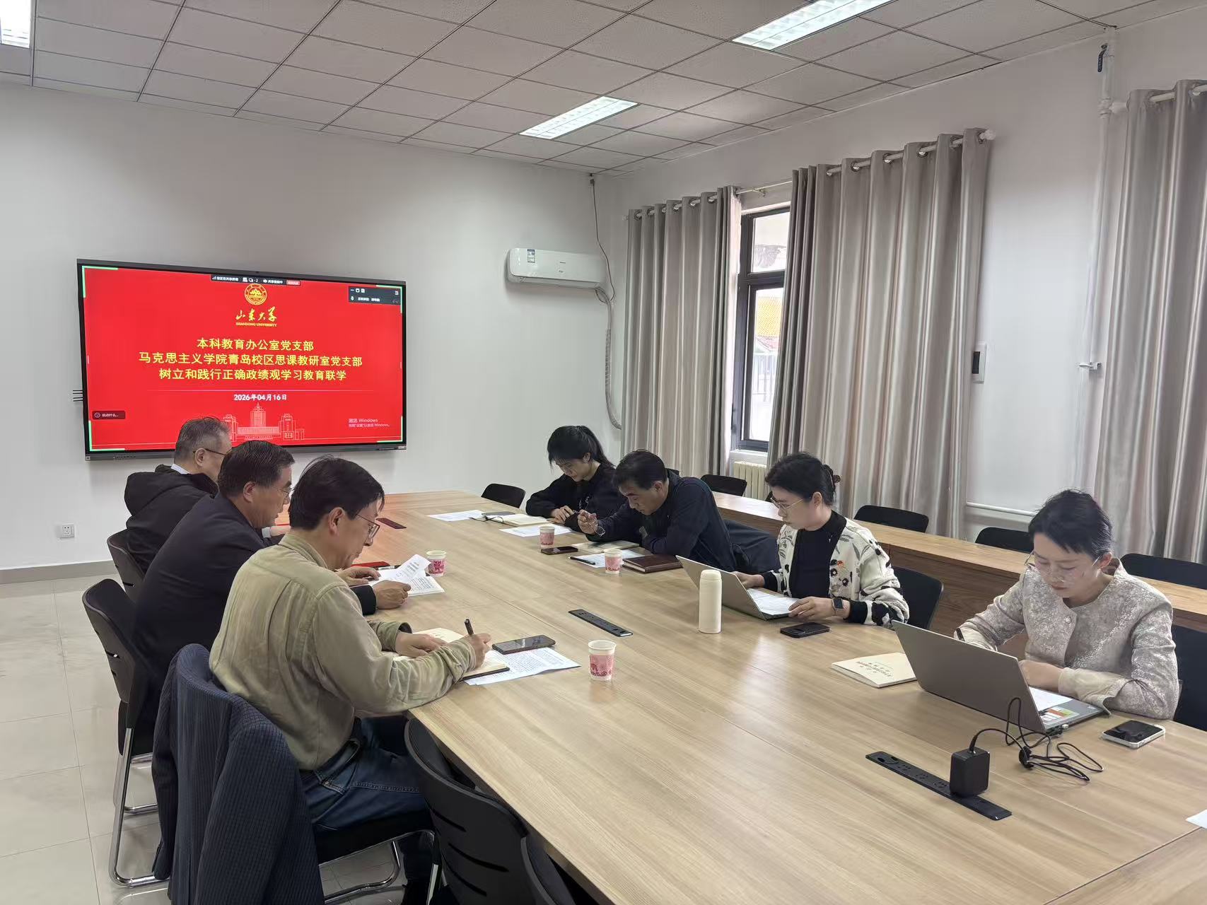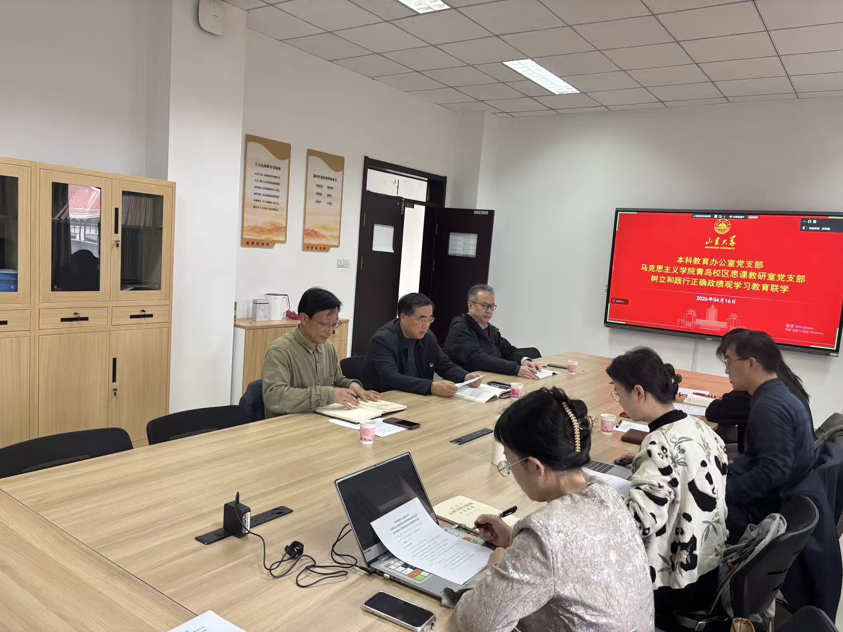 4月16日下午,青岛校区思政课教研室党支部、本科教育办公室党支部在振声苑西楼W413室联合开展树立和践行正确政绩观主题联学共建活动。本科教育办公室党支部书记王丰晓、公共教学管理服务中心副主任王建立、青岛校区思政课教研室党支部书记厉尽国以及双方支部党员共同参加学习活动。