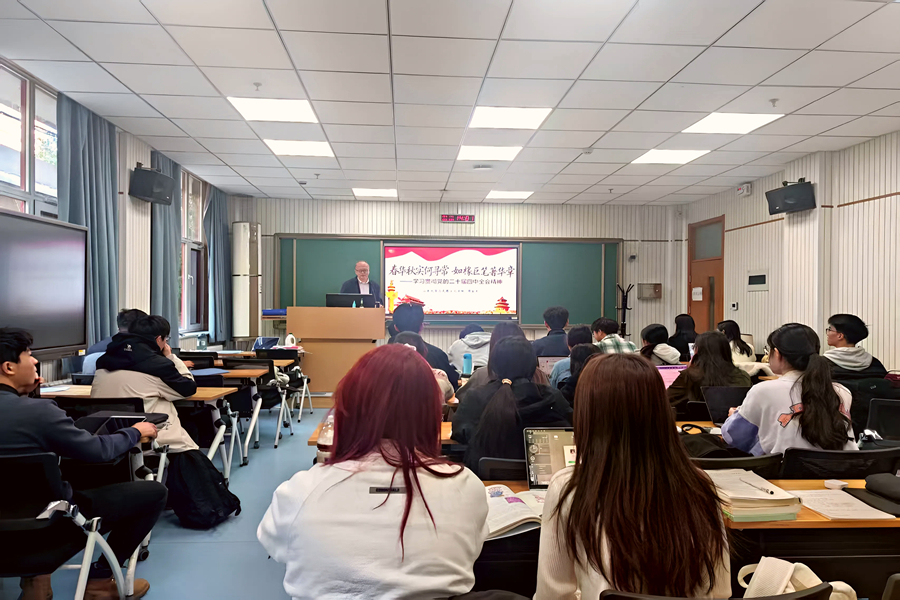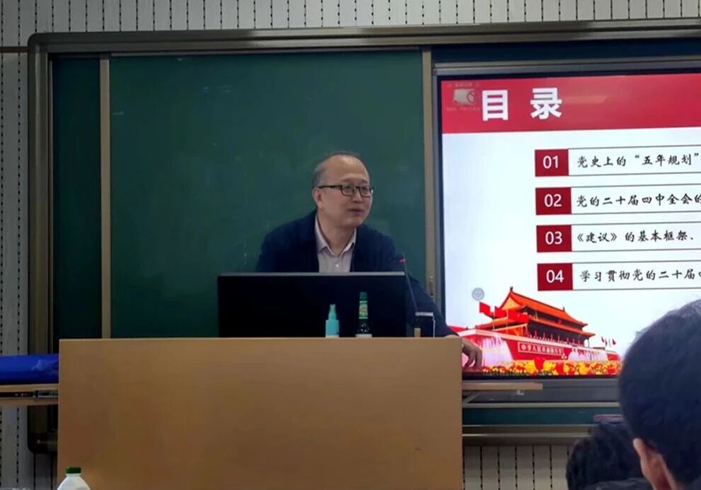 为深入学习领会党的二十届四中全会精神,11月2日下午,山东大学第九期成仿吾英才班理论课教学第三讲在趵突泉校区9号楼104教室举行,马克思主义学院副院长周金龙教授受邀主讲,以“春华秋实何寻常,如椽巨笔著华章”为主题,带领青年学子系统解读党的二十届四中全会精神。班主任尤文梦主持活动,仿吾班全体学员参加学习。