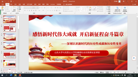 四支分队积极构思宣讲主题和精心准备宣讲内容,多次开展线上线下的集体学习和交流讨论。理论宣讲团第一分队以“新时代历史性成就与变革中蕴含的斗争精神”为宣讲主题,致力于宣真理、鼓志气、铸强魂,认真学习党的十八大以来历次会议精神,;第二分队以“追光——重温习近平总书记山东行”为宣讲主题,多次召开宣讲工作研讨会,对宣讲进度安排、宣讲资料制作、人员训练等方面进行了充分的学习和讨论;第三分队以“党的十八大以来中国文化建设的主要成就”为主题,考察建设社会主义文化强国战略对当地文化发展的影响,结合各地优秀的传统文化进行理论与实际相结合的宣讲;第四分队以“感悟新时代伟大成就,开启新征程奋斗篇章”为宣讲主题,发动队员充分深入基层一线、走进乡村振兴主战场,用实际行动迎接党的二十大胜利召开。