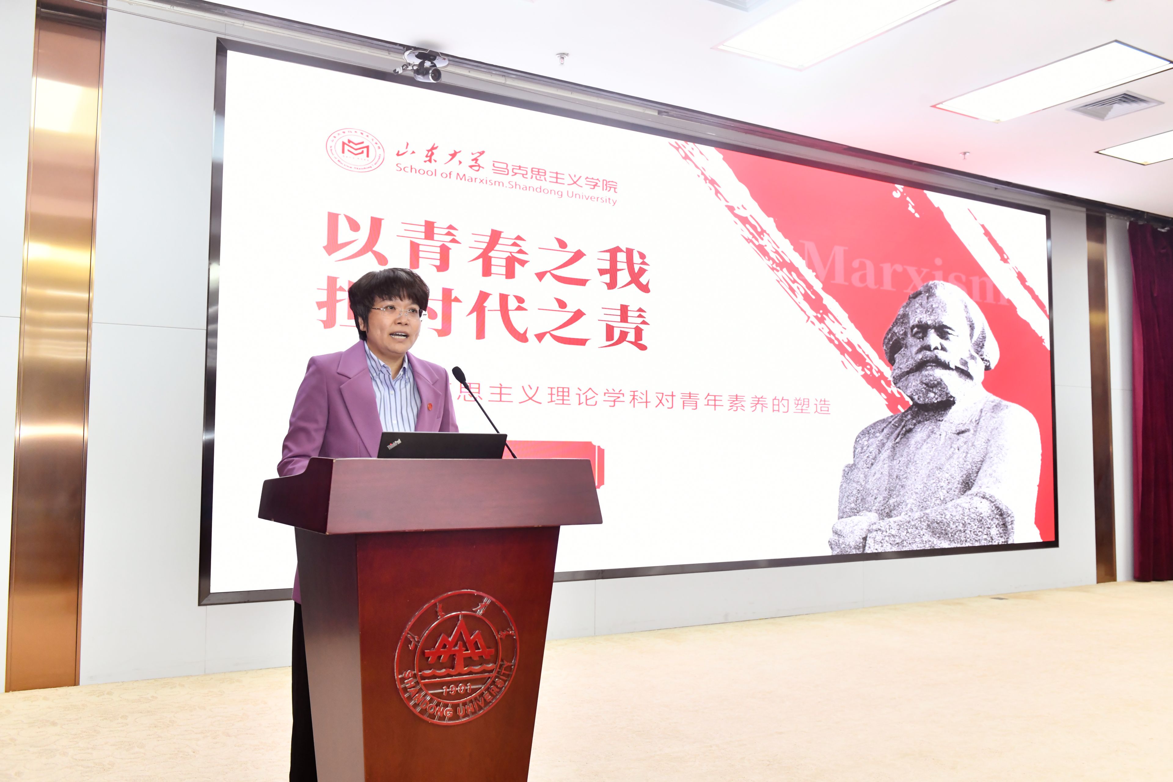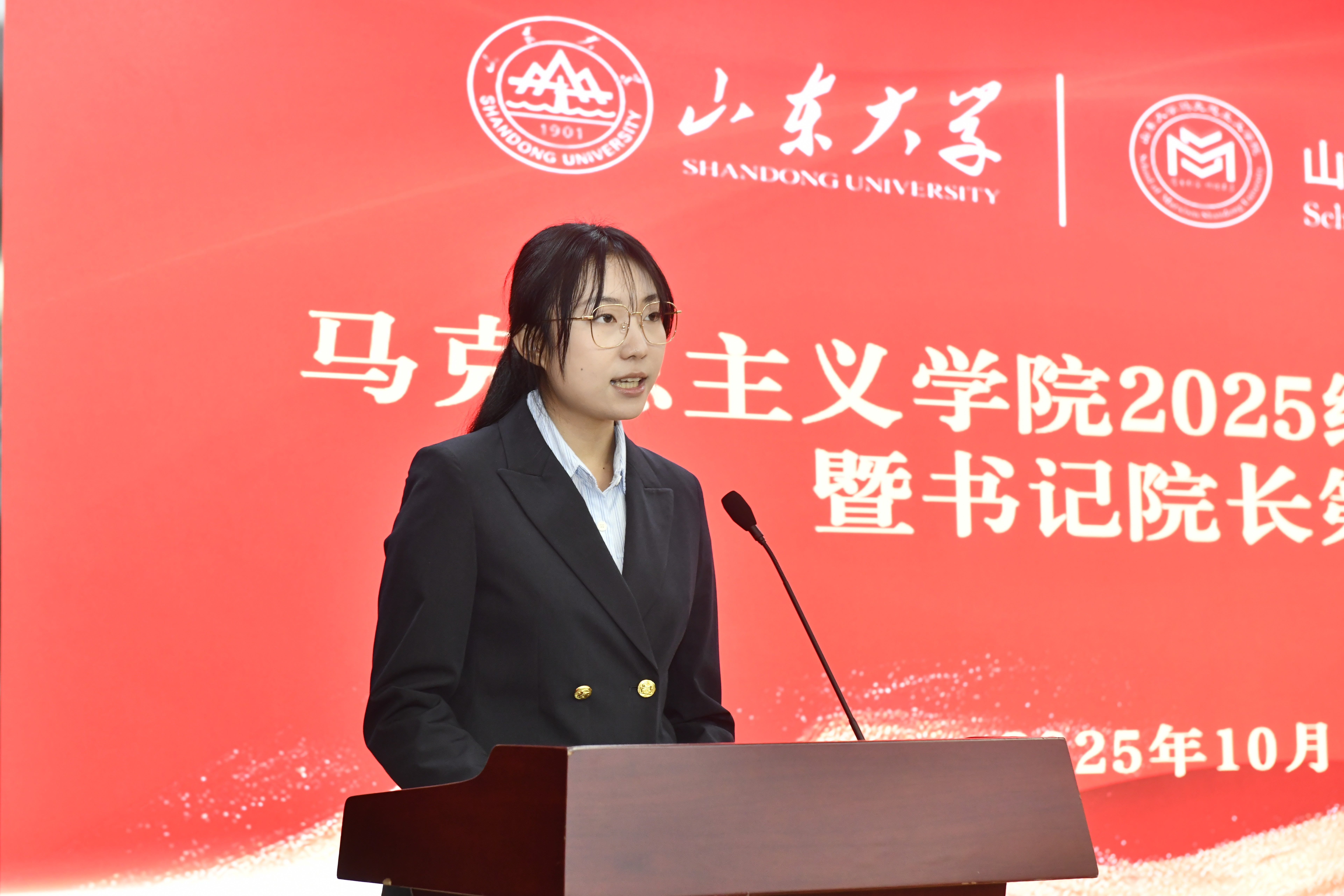 2025级本科生刘芷溪和硕士研究生刘奕兰作为新生代表发言。刘芷溪从山东大学宝贵的红色精神资源切入,紧扣“理论”“实践”“时代”三个关键词,鼓励大家要以“固本求真”的态度,筑牢理论根基;以“知行合一”的追求,锤炼实践能力;以“薪火相传”的担当,履行时代使命。刘奕兰从自身支教经历出发,阐释了对理论与实践相结合的理解,并倡议同学们在深耕理论的同时勇于实践,要在学术道路上坚定前行,更要用脚步丈量青春,将论文写在祖国大地上。
