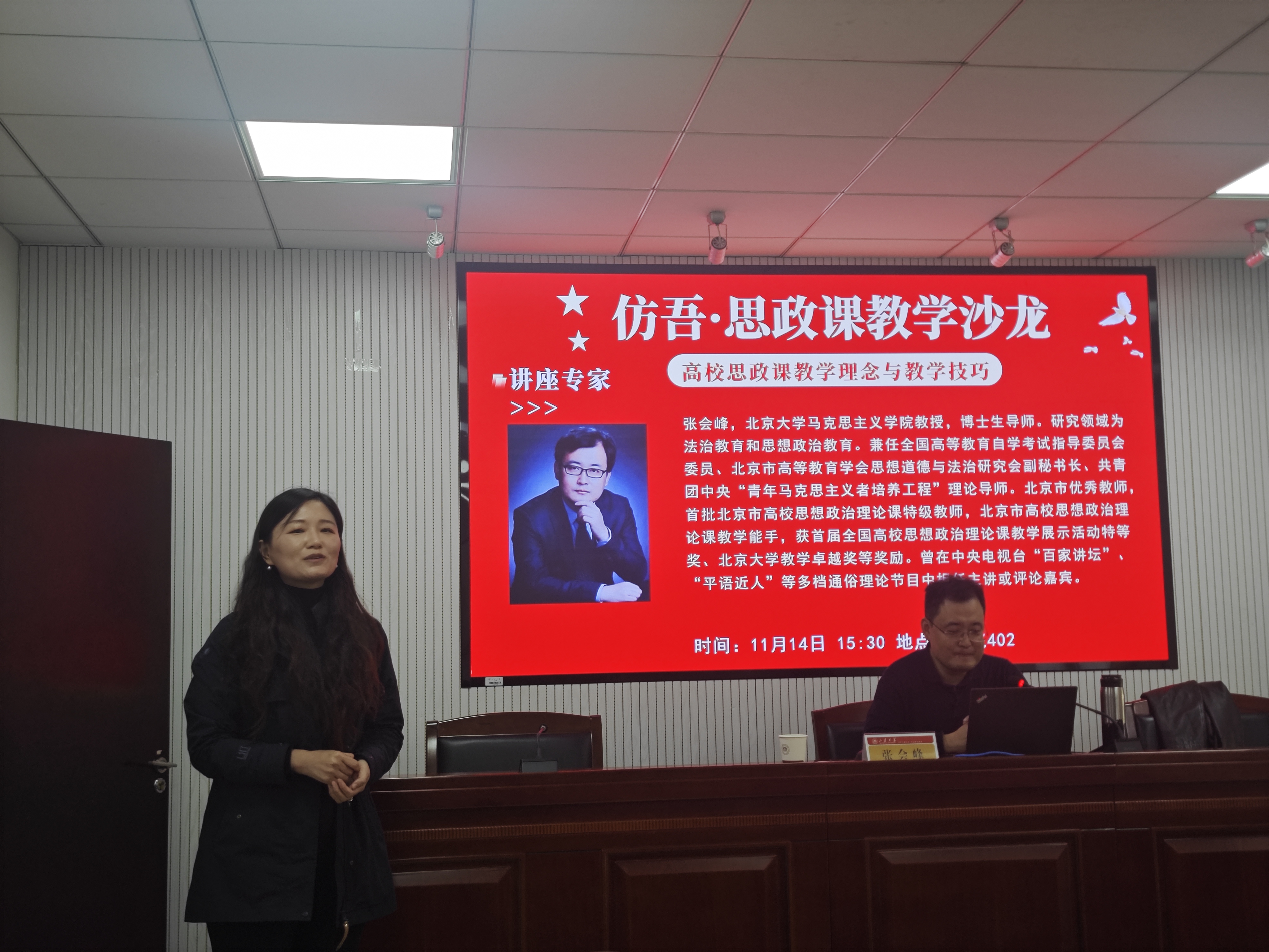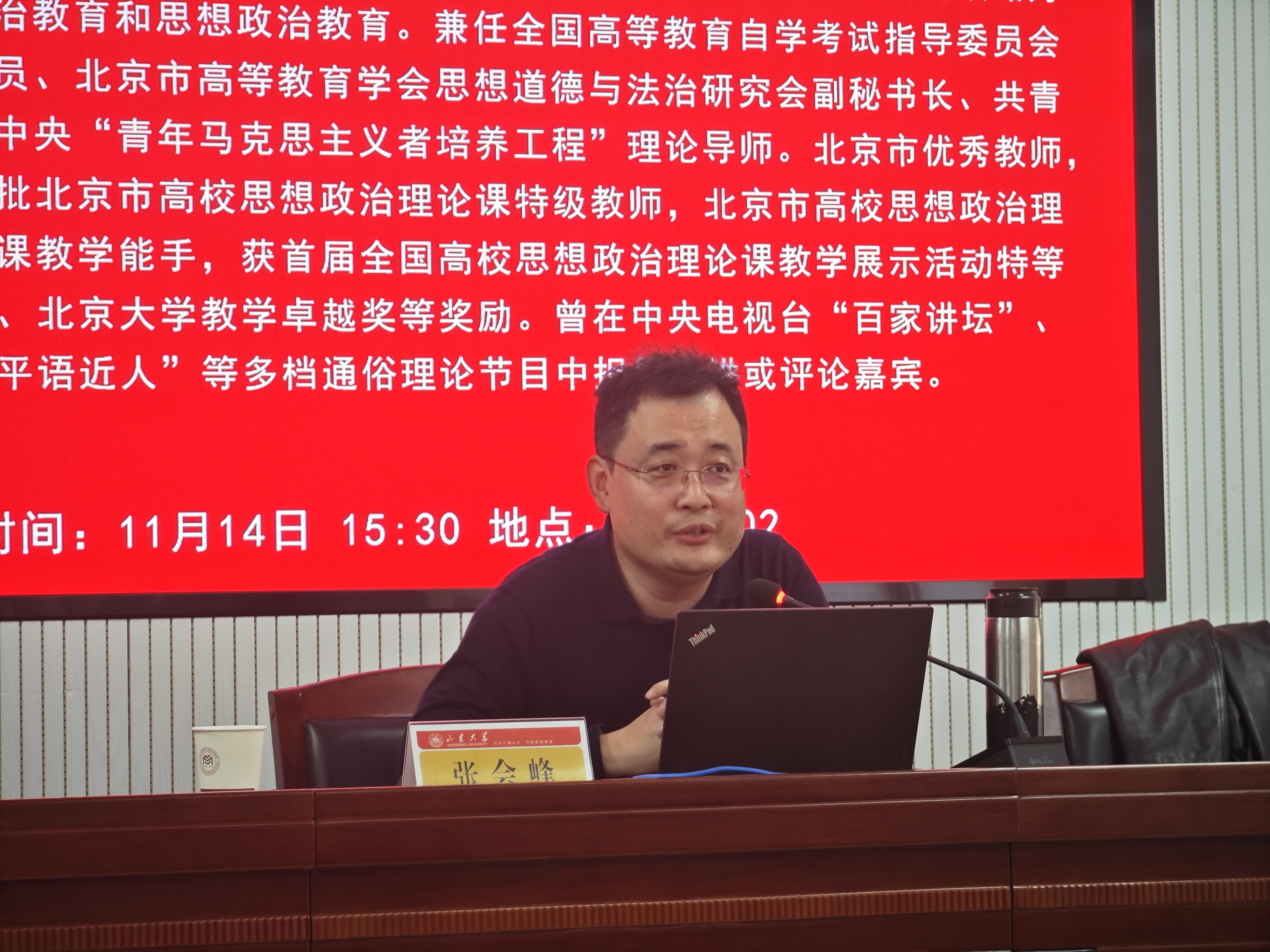 11月14日下午,山东大学马克思主义学院举办“仿吾·思政课教学沙龙”活动。北京大学教学卓越奖获得者、博士生导师张会峰教授应邀作关于“高校思政课教学理念与技巧”的专题报告。讲座由思想道德与法治教研室主任刘佳主持,学院师生代表参与活动。