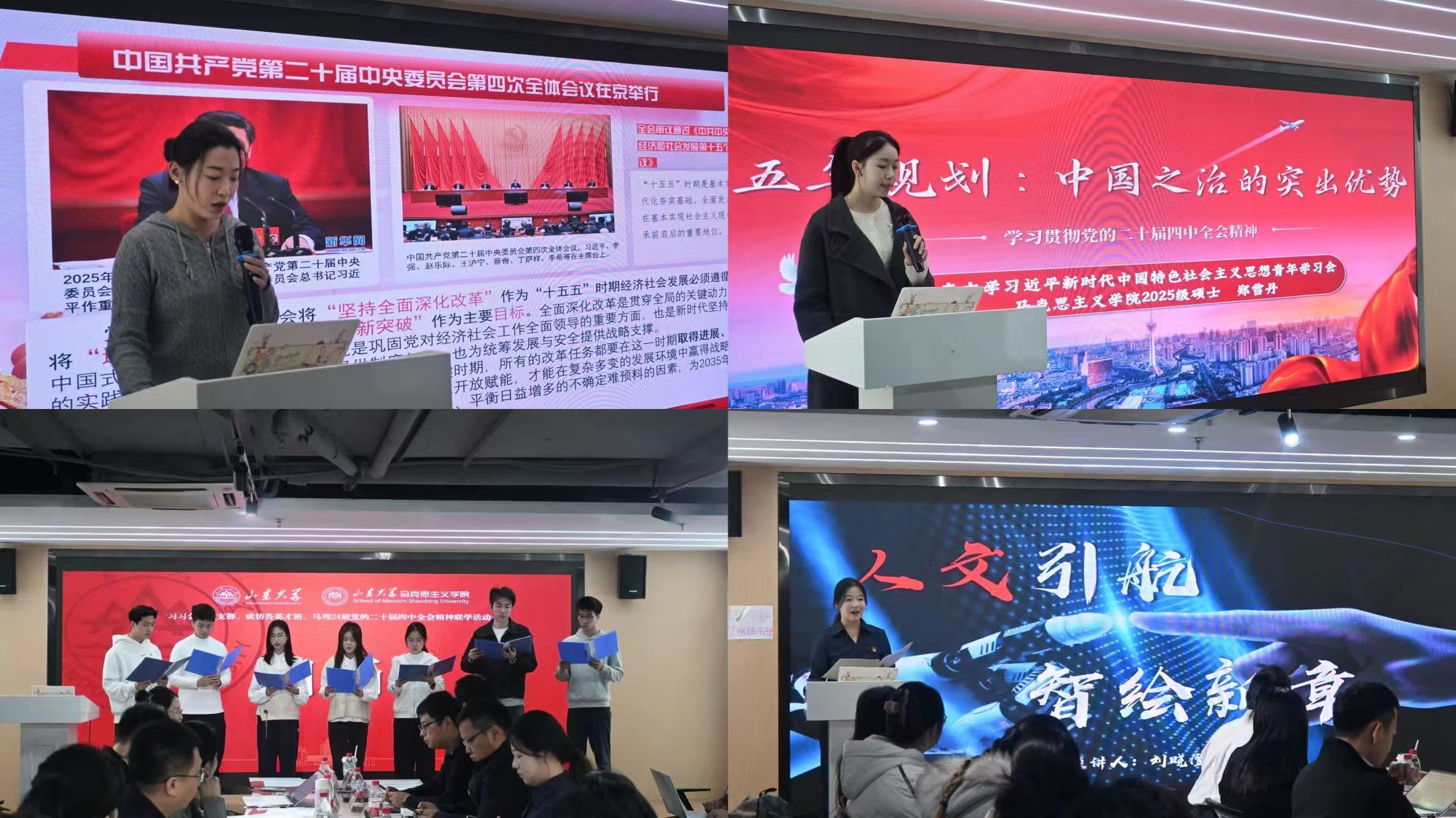 青年学子紧扣全会精神核心要义,以青春之声传递思想力量。“习习会”成员、2023级博士生夏雨以《“十五五” 时期进一步全面深化改革为中国式现代化注入新动能》为题进行宣讲,从改革动力、科技现代化与对外开放等方面对全会精神进行解读。“习习会”成员、2025级硕士生郑雪丹以《五年规划:中国之治的突出优势》为主题,梳理我国十四个五年规划的发展脉络,从目标导向、价值追求与自我完善层面阐释中国特色社会主义的制度优势。“成仿吾英才班”学员带来原创诗朗诵《青年人心中的新质生产力》,以饱含深情的诗意表达,生动诠释青年对新质生产力的理解与担当。马克思主义学院2024级本科生刘晓澄作《人文引航,智绘新章》的主题演讲,表示青年应成为“追问技术意义的文明守望者”,以人文关怀赋能新质生产力发展。