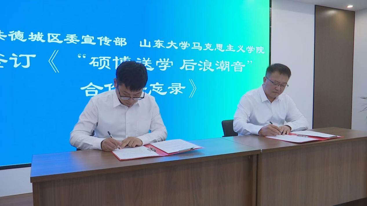 随后,德城区青年宣讲员进行了宣讲汇报,介绍了德城区青年宣讲工作的进展。在庄重热烈的氛围中,双方共同签订了《“硕博送学·后浪潮音”合作备忘录》,标志着“硕博送学·后浪潮音”宣讲实践项目联络站正式落户德城区。