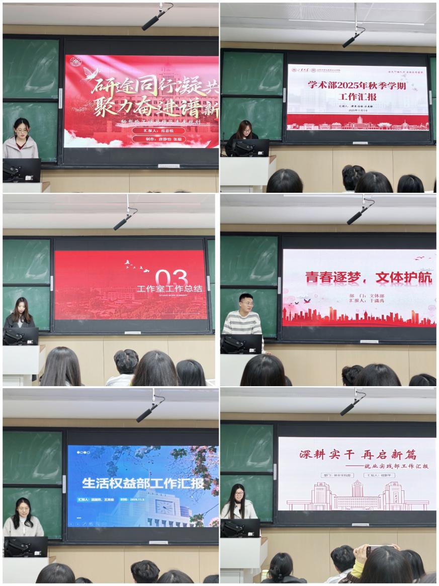接下来,研究生会各部门负责人依次进行部门工作总结和未来展望。秘书处立足自身职能回顾总结了周报、月报、值班等常规工作,并对后续党史情景剧演绎大赛、“导学思政”下午茶等品牌活动展开规划,表示接下来将继续以多方联动激发工作合力,促进各项工作提质增效。学术部介绍了协助奖学金评选、学生学术成果统计等基础工作,表示将重点打造“青马学术沙龙”、“导师说”等学术品牌并拓展“经典阅读”等特色活动。科技与人文面对面工作室总结近期开展的各类讲座并介绍后期工作计划,表示将持续深化“一院一品”项目,搭建师生学术交流平台。文体部回顾近期“导学思政”合唱比赛、体育文化节、荧光夜跑等活动成果,在总结已有成绩的同时提出将筹备“导学思政”益智桌游、校园广场舞大赛等丰富多彩、形式多样的文体品牌,努力开拓师生课外活动新空间。生活权益部汇报了新生开学服务保障的各项工作,总结宿舍文化节、学生提案大赛等品牌活动以及“权益守护双通道”的创新做法,表示新学期将持续创新权益维护,在融入同学中实现同频共振。就业实践部系统介绍了选调工作的开展情况,深入打造“职”引未来、“青马职达”等就业品牌,提出将继续强化就业资源的整合力度,为实现学院毕业生高质量就业贡献力量。