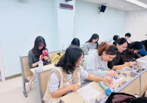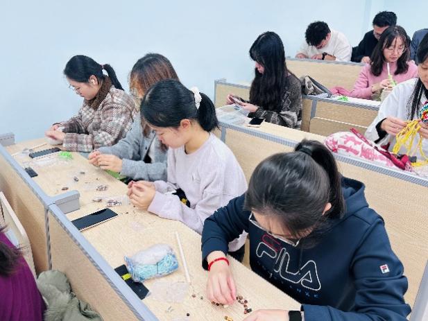 活动现场,4个手工操作台依次排开,艾叶、陈皮、金银花等中草药与卡纸、手串绳等材料整齐摆放,周边张贴的中草药功效科普海报与非遗手工历史展板,营造出浓厚的文化氛围。同学们先通过科普视频系统学习中医药文化渊源,随后在视频教学指导下,体验中草药拼贴画、中药DIY手串、香囊制作、艾草锤四类手工技艺。大家发挥创意,将苍术、佩兰等药材融入香囊设计,用山楂干、桂花等制作成寓意吉祥的拼贴画,在穿绳打结、捶打艾草的过程中,既掌握了传统手工技能,又深刻感受了中医药文化的独特魅力。