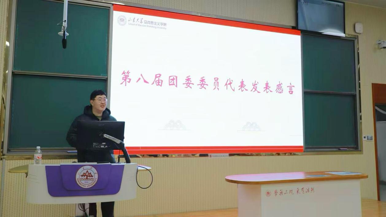 学生团委兼职副书记宋雅雯宣读第八届团委换届结果,希望新一届团委成员们继续怀着饱满的热情与坚定的信念服务同学,做到“踏踏实实工作,健健康康成长,快快乐乐生活”,将马克思主义学院团委打造成一支团结、温暖、高效、进步的组织。学生团委兼职副书记孙龙宇结合自身工作经历,分享了在工作中汲取的教训与获得的成长,回顾了在团委收获的友谊与温暖,表达了对团委新成员的欢迎与期望,希望团委全体成员都能在服务同学、奉献集体的过程中践行初心。