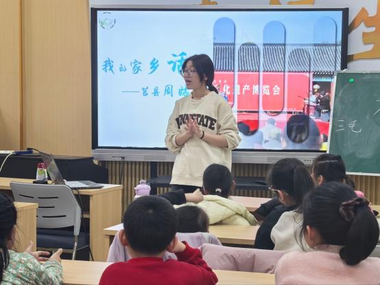 课堂上,实践团成员以“我的家乡话”为核心,从方言的历史渊源、地域特色出发,带领孩子们开启了一场方言文化之旅。课程中不仅介绍了粤语、闽南语、客家话等南方方言的独特魅力,讲解了各地方言的发音特点、经典词汇与代表歌曲,更将重点落在山东本土方言与莒县特色文化上。从济南话亲切的“老师儿”、青岛话极具海洋气息的“哈啤酒、吃嘎啦”,到临沂话豪爽的“中”,再到山东方言独有的倒装句趣味表达,实践团成员通过趣味发音、情景对话、词汇比拼等形式,让孩子们在轻松的氛围中感受山东方言的鲜活韵味。当莒县非遗周姑戏的“拉魂腔”唱腔与莒县方言词汇亮相课堂时,孩子们更是倍感亲切,纷纷跟着实践团成员学说家乡话,沉浸式体验本土语言文化的魅力。