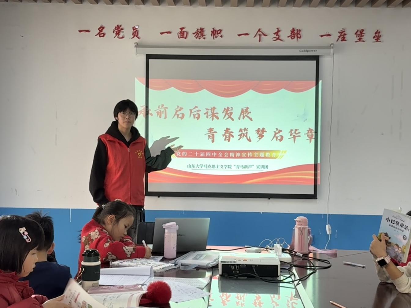 为深入学习贯彻党的二十届四中全会精神,深化党史学习教育,2月6日,山东大学马克思主义学院“青马新声”宣讲团赴济南市长清区双龙山社区党群服务中心,开展了一场知行合一的主题宣讲与实践活动,将理论宣讲与社区服务相结合,让党的创新理论在基层一线焕发活力。
