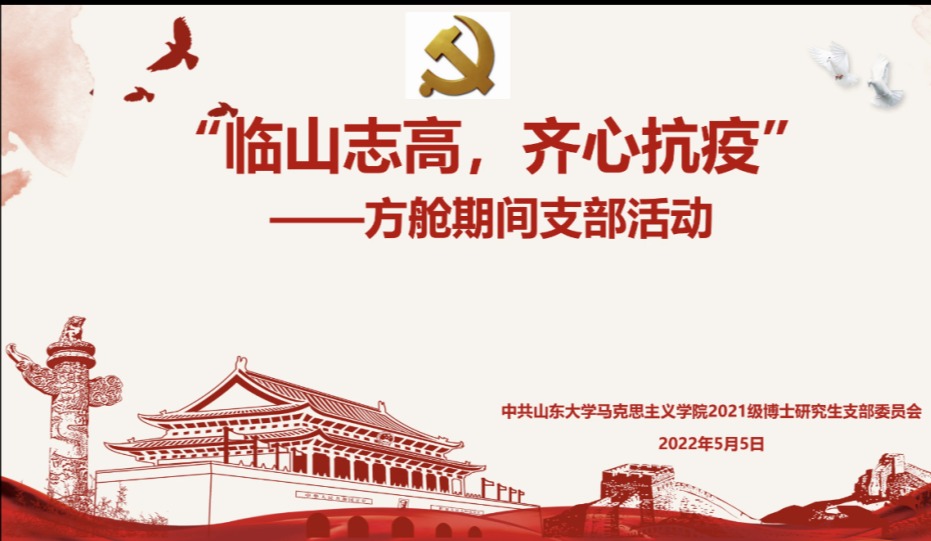 面对突如其来的疫情,马院300余名师生在学校统一安排下安全转移到齐国故都——临淄。初入方舱,为了同学们更好地落实学校防疫政策和要求、了解临淄文化和就业情况,5月5日晚,马克思主义学院2021级博士研究生党支部举办“临山志高,齐心抗疫”主题党日活动。现就职于淄博市人力资源和社会保障局的山东大学优秀校友刘若凡参加活动并以“齐文共读·感悟齐文化”为主题宣讲,活动由党支部书记孔玺铭主持,2021级博士研究生党支部全体党员在线参与。