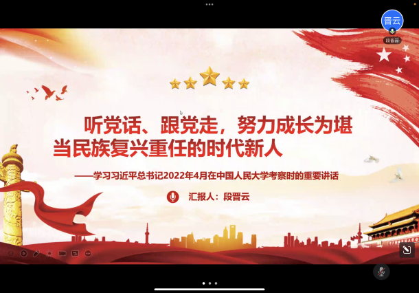 在理论学习环节,张超以内容、背景、价值为视角领学了习近平总书记《在全国抗击新冠肺炎疫情表彰大会上的讲话》,重点阐释了“生命至上、举国同心、舍生忘死、尊重科学、命运与共”的伟大抗疫精神;段晋云领学了习近平总书记在中国人民大学考察时的重要讲话,从价值要求、素质要求和实践要求三个方面,阐释了坚定不移听党话、跟党走、努力成长为堪当民族复兴大任的时代新人的战略价值和实践路径。