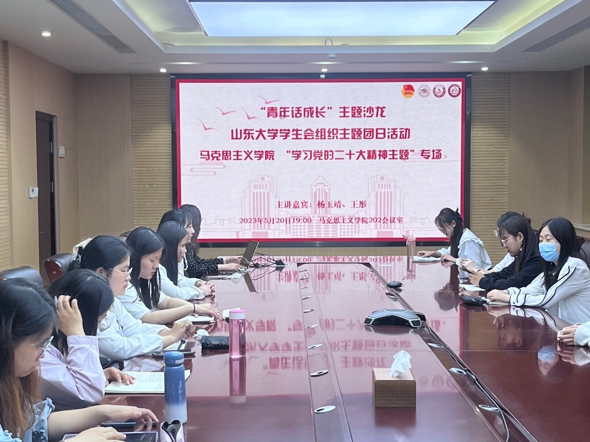 为深入学习宣传贯彻习近平新时代中国特色社会主义思想和党的二十大精神,帮助同学们更好地了解大学生活,合理规划个人成长发展,校团委指导各学院学生会开展“青年话成长”主题沙龙山东大学学生会组织主题团日活动。5月20日,山东大学马克思主义学院研究生会组织开展“学习党的二十大精神主题”专场宣讲,习近平新时代中国特色社会主义思想青年学习会的两位宣讲员2022级硕士研究生杨玉靖和王彤为大家作交流分享。活动由学术部干事2022级硕士侯孝彩主持,马克思主义学院研究生会30余名成员参与了本次活动。