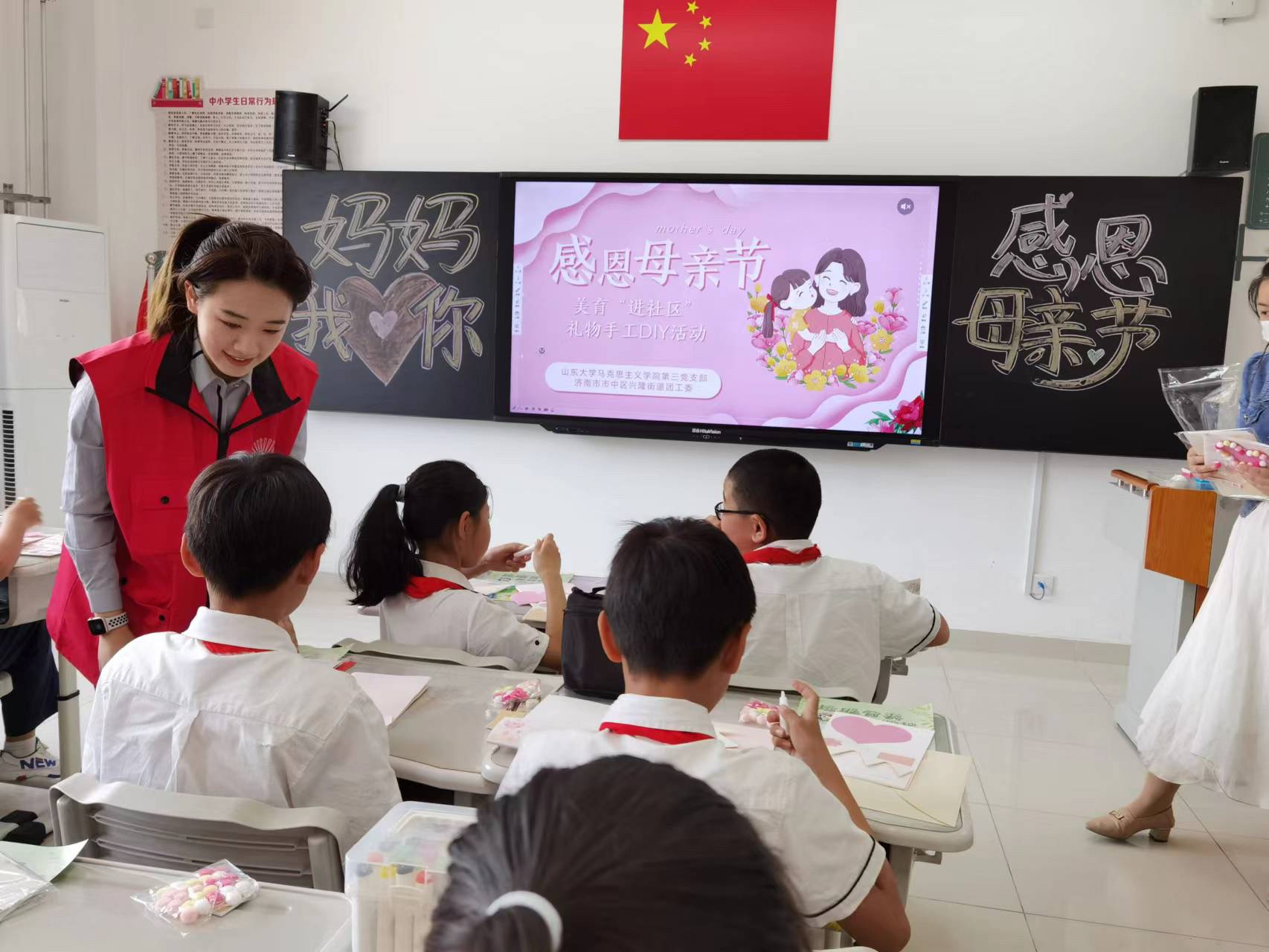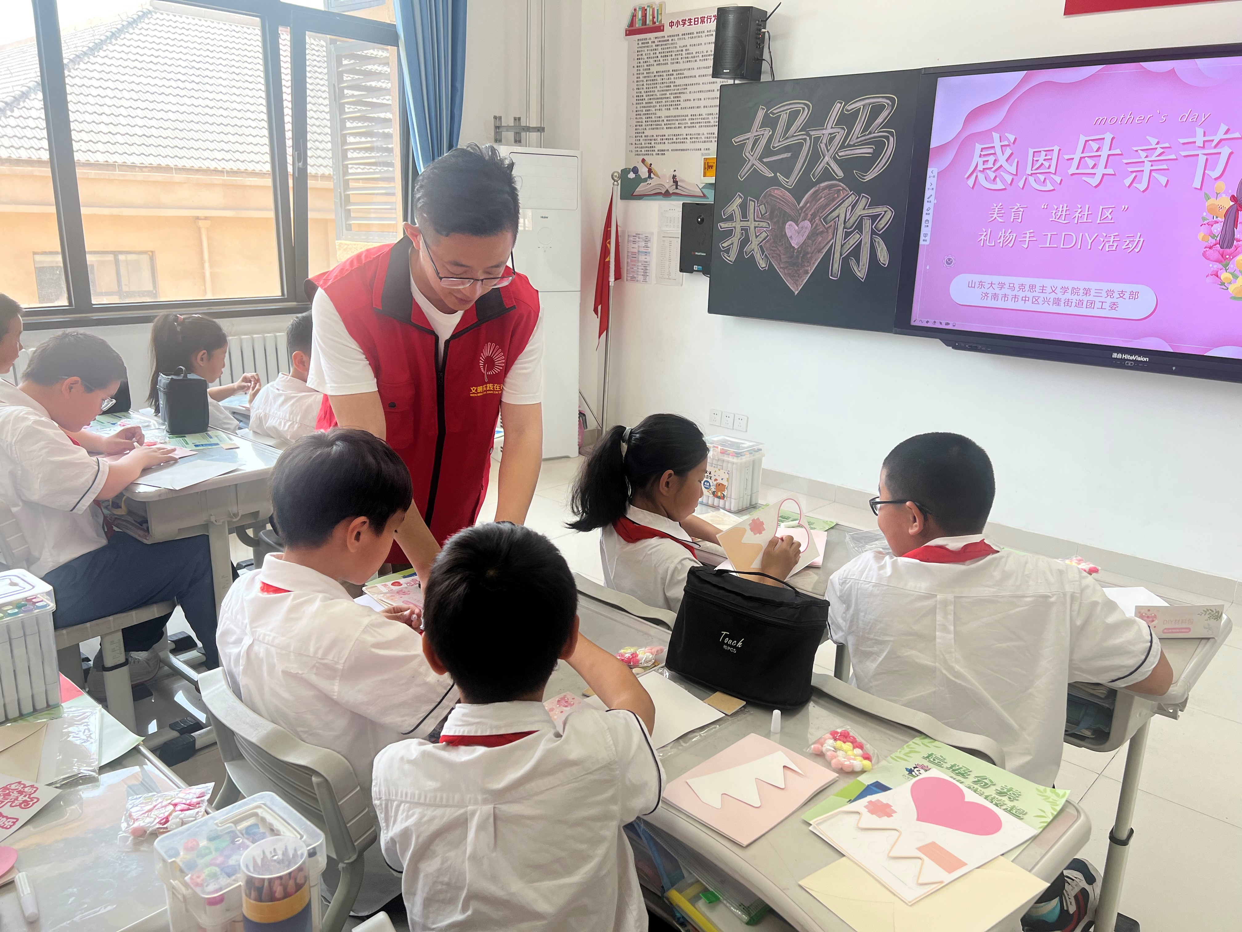 随后,支部成员李润哲、高缘、王冠文、赵柔萱教授学生们制作母亲节手工贺卡,鼓励同学们发挥想象力与创造力,做出独一无二的母亲节贺卡送给妈妈。同时向学生们传递美育理念与价值,致力于提高学生们对“美”的认知与关注,进一步加强了同学们的文化艺术素养。