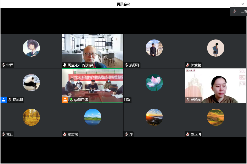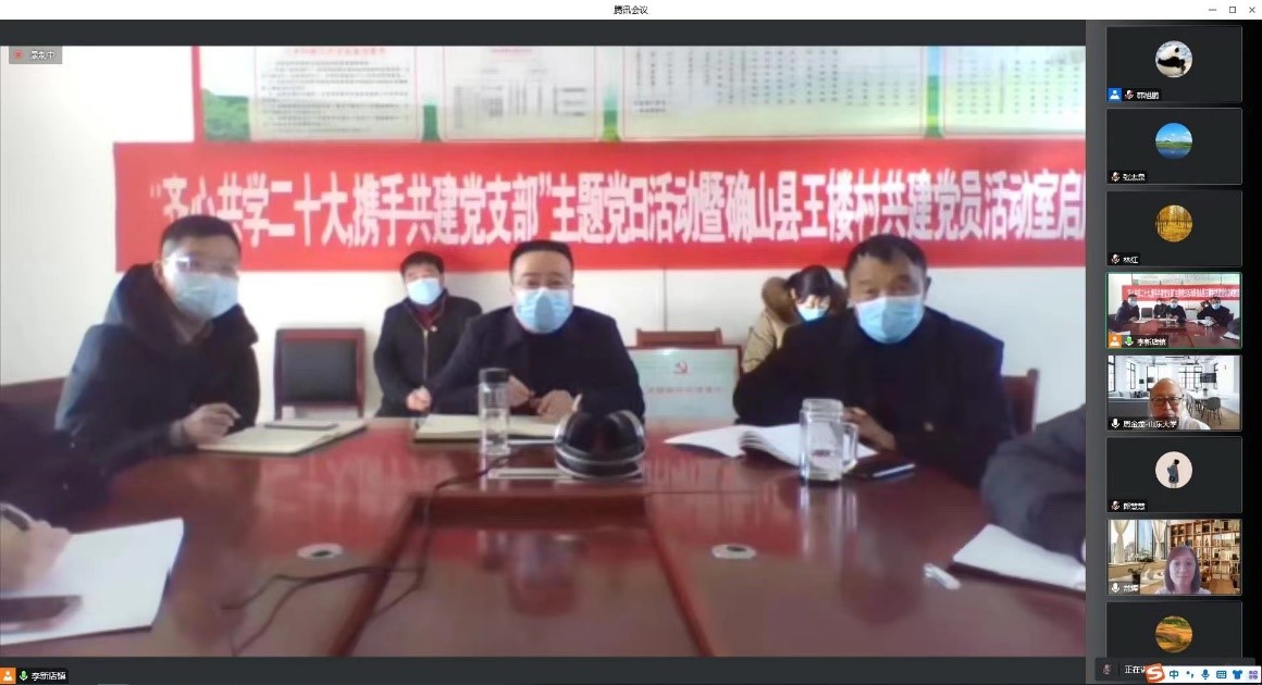 12月14日上午,为深入学习宣传贯彻党的二十大精神,努力构建“资源共享、优势互补、互相促进、共同提高”的党建工作新格局,山东大学马克思主义学院习近平新时代中国特色社会主义思想概论教研室党支部与李新店镇王楼村党支部举行“齐心共学二十大、携手共建党支部”主题党日活动暨确山县王楼村共建党员活动室线上启用仪式。山东大学马克思主义学院党委书记马晓琳和确山县李新店镇党委书记吴东升出席会议并发表讲话,学院副院长周金龙主持会议,习近平新时代中国特色社会主义思想概论教研室党支部和李新店镇王楼村党支部的部分成员参加了活动。