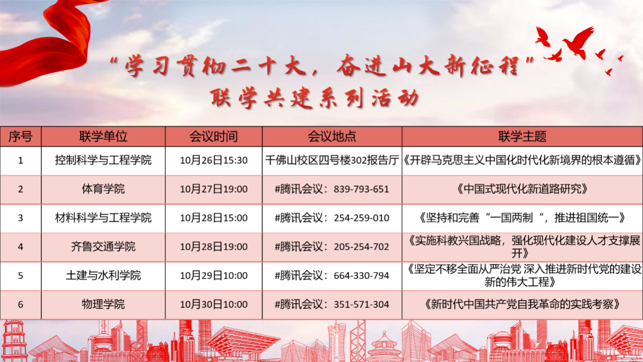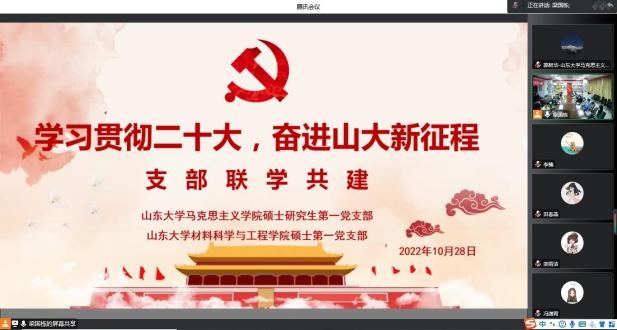 为组织广大学生党员深入习党的二十大精神,马克思主义学院硕士研究生第一党支部充分发挥马理论研究生党员的独特优势,积极与控制科学与工程学院、体育学院、材料科学与工程学院、齐鲁交通学院、土建与水利学院、物理学院等学院的研究生党支部共同开展“喜迎党的二十大,奋进山大新征程”联学共建系列活动。