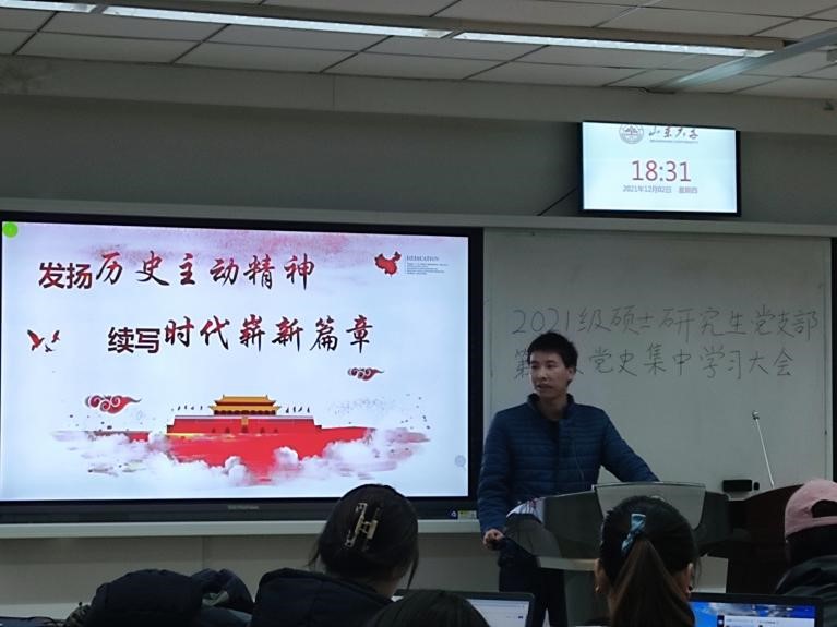 为深入学习贯彻党的十九届六中全会精神,持续推动党史学习教育走深走实,2021年12月2日,我院2021级硕士研究生党支部召开第二次党史集中学习大会。本次会议由党支部书记刘智泉主持,支部全体党员、预备党员参加,入党积极分子和团员同学也受邀参与此次会议。